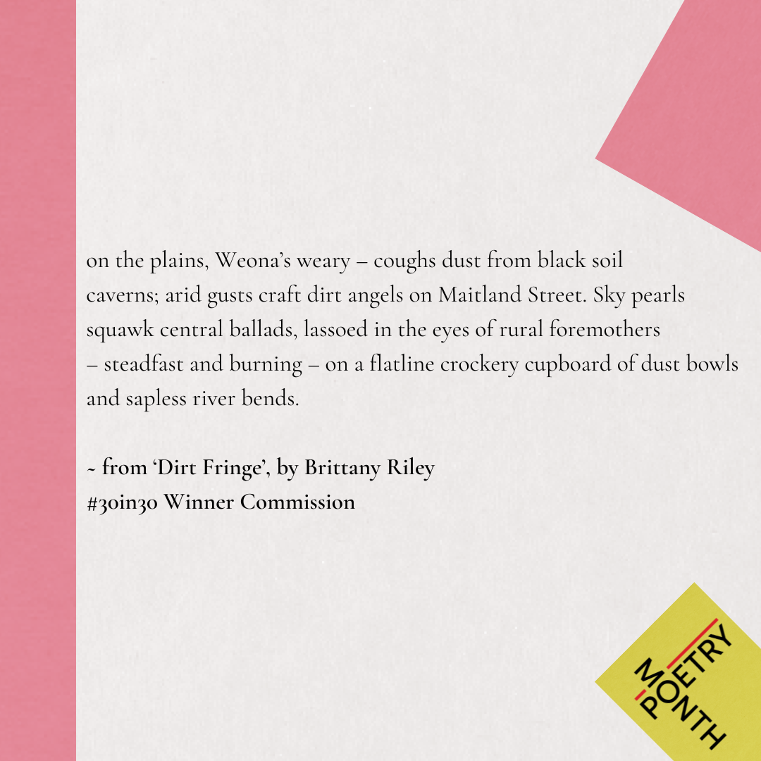 Each year as part of Poetry Month, we run the 30in30 Writing Competition. Writers from across the continent are encouraged to enter a 3-line poem or excerpt to win a book by a contemporary Australian poet every day of the month. Four poets were selected from over 2,400 entries to develop their poem further with editorial support from Red Room Poetry staff, and paid publication of their poem. In 2023, the winners of the competition were Katie Shammas, Brittany Riley, Julian Matthews and Jake Dennis.